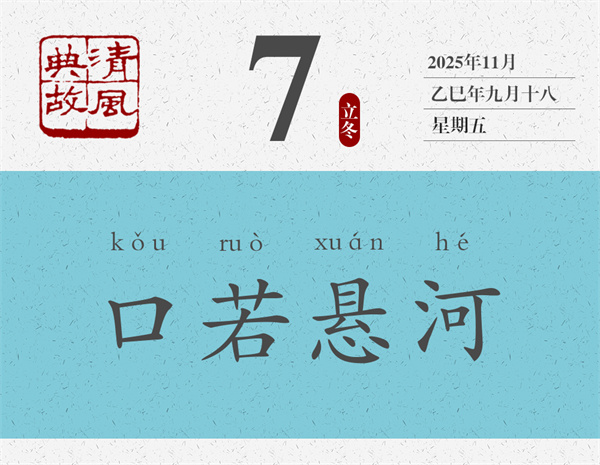 《世說新語》將王衍此語收入“賞譽(yù)”類,文字幾乎原文照抄了《晉書·郭象傳》里的話:“王太尉云:‘郭子玄語議如懸河寫(同“瀉”)水,注而不絕。”王太尉即王衍,郭子玄即郭象。“如懸河瀉水”是什么意思?一,有話可說,而且有說不完的話;二,口才非常好,凡是心里能想到的,嘴里都能說出來。三,說話很有氣勢,不哼哼哈哈,不磨磨嘰嘰,也不“這個(gè)這個(gè)”“那個(gè)那個(gè)”地沒完沒了。后世即以“口若懸河”為典,形容一個(gè)人表達(dá)能力超群,說起話來滔滔不絕。