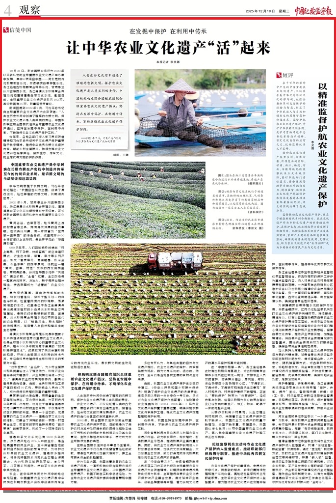 農(nóng)業(yè)文化遺產(chǎn)保護(hù)任重道遠(yuǎn)。申遺成功并非終點(diǎn),而是新的起點(diǎn),后續(xù)仍需持續(xù)挖掘和推廣系統(tǒng)價(jià)值。屬地紀(jì)檢監(jiān)察機(jī)關(guān)立足職能職責(zé),主動(dòng)將農(nóng)業(yè)文化遺產(chǎn)保護(hù)納入監(jiān)督重點(diǎn),著力推動(dòng)農(nóng)業(yè)文化遺產(chǎn)在發(fā)掘中保護(hù)、在利用中傳承,推進(jìn)中華優(yōu)秀農(nóng)耕文化保護(hù)傳承。