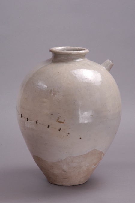 唐代,移交,初出土于武威弘化公主墓。高40.5厘米,口徑12厘米,底徑12.3厘米。圓唇,小口外卷沿,束頸,圓肩,下腹斜收,平底。肩部斜置一管狀短流。胎表有白色化妝土,通體施白釉,釉不及底,釉面光潤(rùn)且有細(xì)碎冰裂紋。器身無(wú)花紋,造型規(guī)整、飽滿,具有鮮明的唐代風(fēng)格。