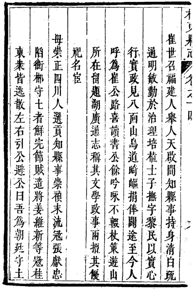 崔世召族孫崔秉鏡于康熙十一年(1672)出任浙江寧海知縣。第二年,耿精忠為禍東南,社會動蕩。崔秉鏡通過核查縣庫、動員士紳、請求上級支援等多種渠道,籌集足夠的糧草,既滿足軍隊(duì)需求,又未過分加重百姓負(fù)擔(dān)。他組織防御有方,《福建通志列傳補(bǔ)編》說“寧海不遭兵燹,秉鏡之功也”。事后,崔秉鏡大力恢復(fù)生產(chǎn)。尤為難得的是,當(dāng)他得知鄰近的天臺、仙居兩縣有許多百姓被強(qiáng)盜擄掠后,他設(shè)法營救出兩百多名男女。這一義舉贏得了三縣百姓的深深感激。