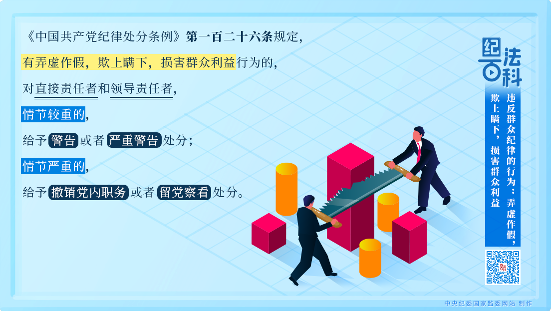 《中國(guó)共產(chǎn)黨紀(jì)律處分條例》第一百二十六條規(guī)定,有弄虛作假,欺上瞞下,損害群眾利益行為的,對(duì)直接責(zé)任者和領(lǐng)導(dǎo)責(zé)任者,情節(jié)較重的,給予警告或者嚴(yán)重警告處分;情節(jié)嚴(yán)重的,給予撤銷黨內(nèi)職務(wù)或者留黨察看處分。