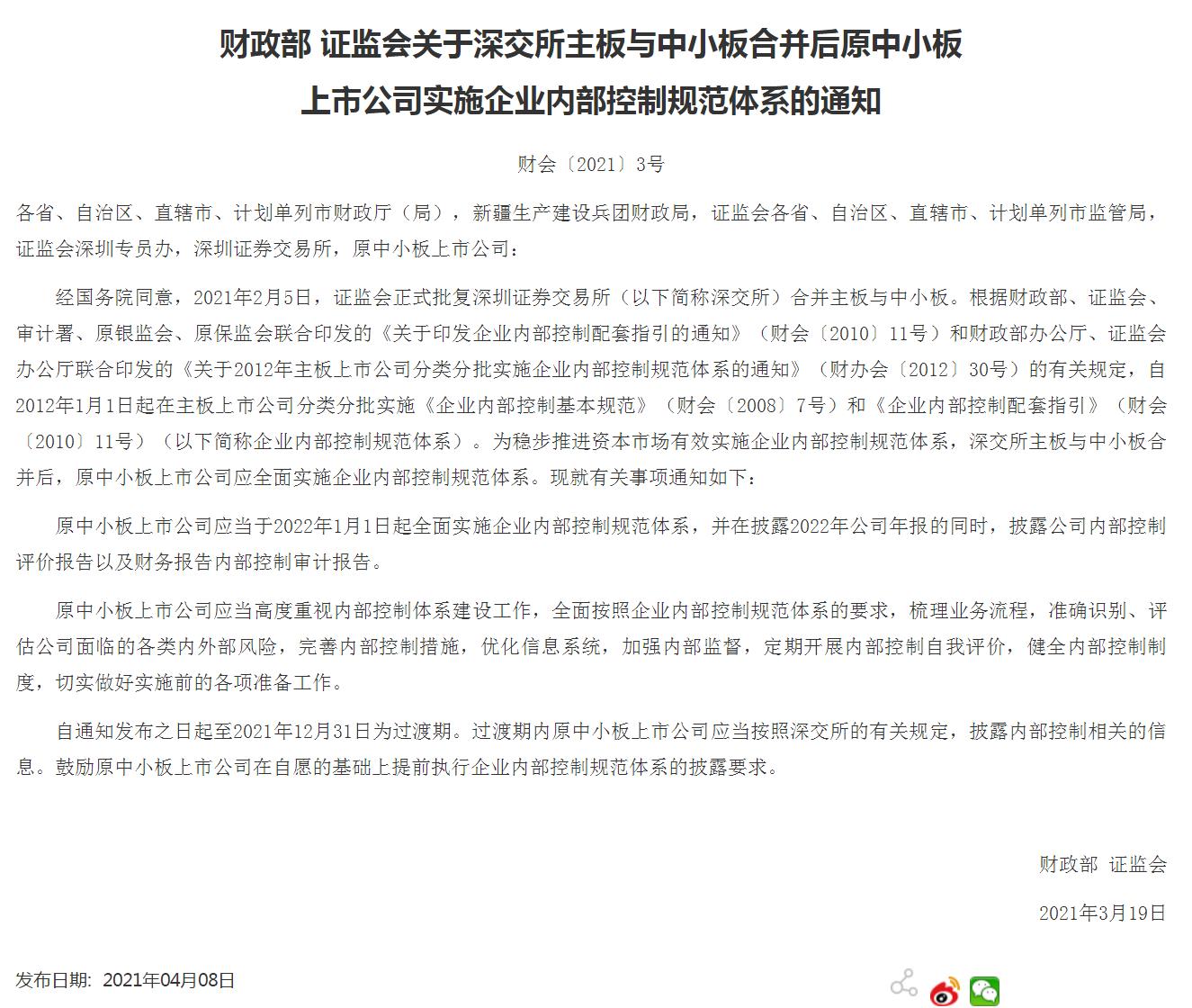 兩部門:原中小板公司2022年1月1日起實施內(nèi)控規(guī)范體系