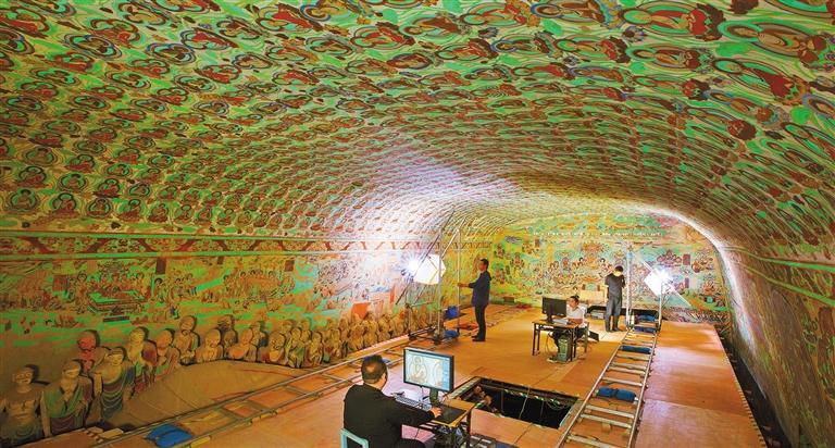 莫高窟第148窟數(shù)字化采集工作現(xiàn)場(chǎng)。敦煌研究院在國(guó)內(nèi)率先進(jìn)行文物數(shù)字化的探索研究,形成了一套科學(xué)的壁畫彩塑數(shù)字化技術(shù),制定了14項(xiàng)文物數(shù)字化保護(hù)技術(shù)標(biāo)準(zhǔn)與規(guī)范。