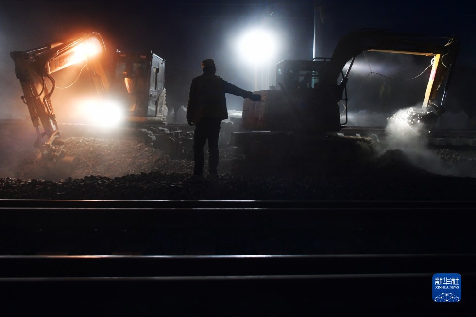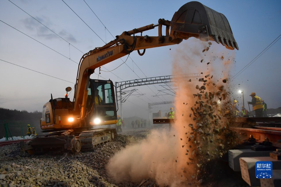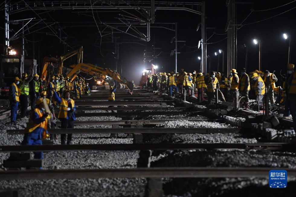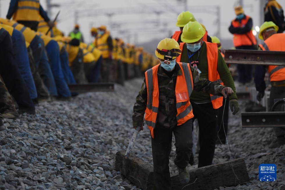 中鐵十一局建設(shè)者在中蘭客專(甘肅段)接入中川城際鐵路道岔插鋪施工現(xiàn)場作業(yè)(4月26日攝)。新華社記者 陳斌 攝