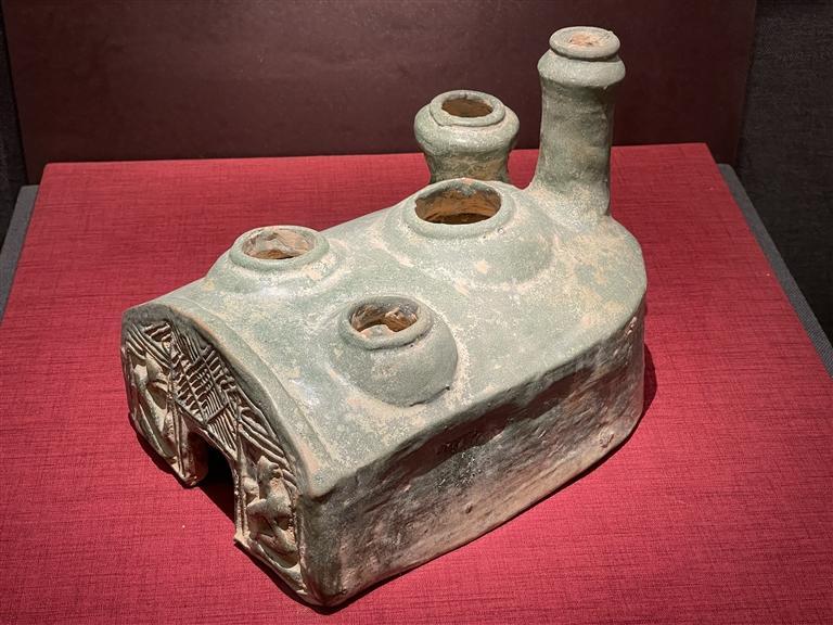 綠釉陶灶高21厘米,長28厘米,寬19.5厘米,為蘭州市博物館館藏二級文物。陶灶反映了當(dāng)時人們的生產(chǎn)生活和思想觀念。漢代之所以流行陶灶模型,主要原因有二,一是兩漢時期大土地所有制經(jīng)濟的盛行使得豪門貴族占據(jù)社會主要地位,而“事死如事生”的觀念促使他們隨葬大量明器,以求在陰間繼續(xù)享受榮華富貴。二是由于漢代的祭灶思想助推了陶灶的流行。