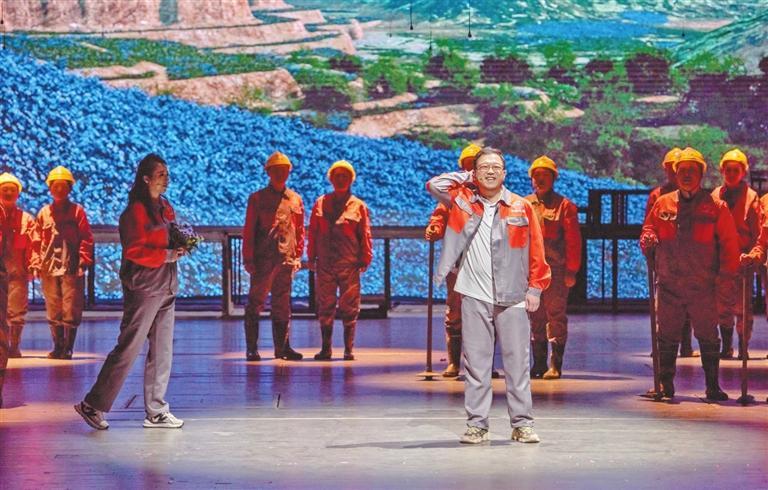 在兩個(gè)小時(shí)的演出中,全體演職人員以群像式表演,將蘭渝鐵路建設(shè)者的科技創(chuàng)新精神、愚公移山精神、大國(guó)工匠精神完美展現(xiàn)在舞臺(tái)上。“那座山,不太高,胡麻花開山上頭,山根根,開洞洞,火車鉆進(jìn)山里頭……”伴隨著悠揚(yáng)的謝幕音樂,劇場(chǎng)內(nèi)爆發(fā)出了經(jīng)久不息的熱烈掌聲。