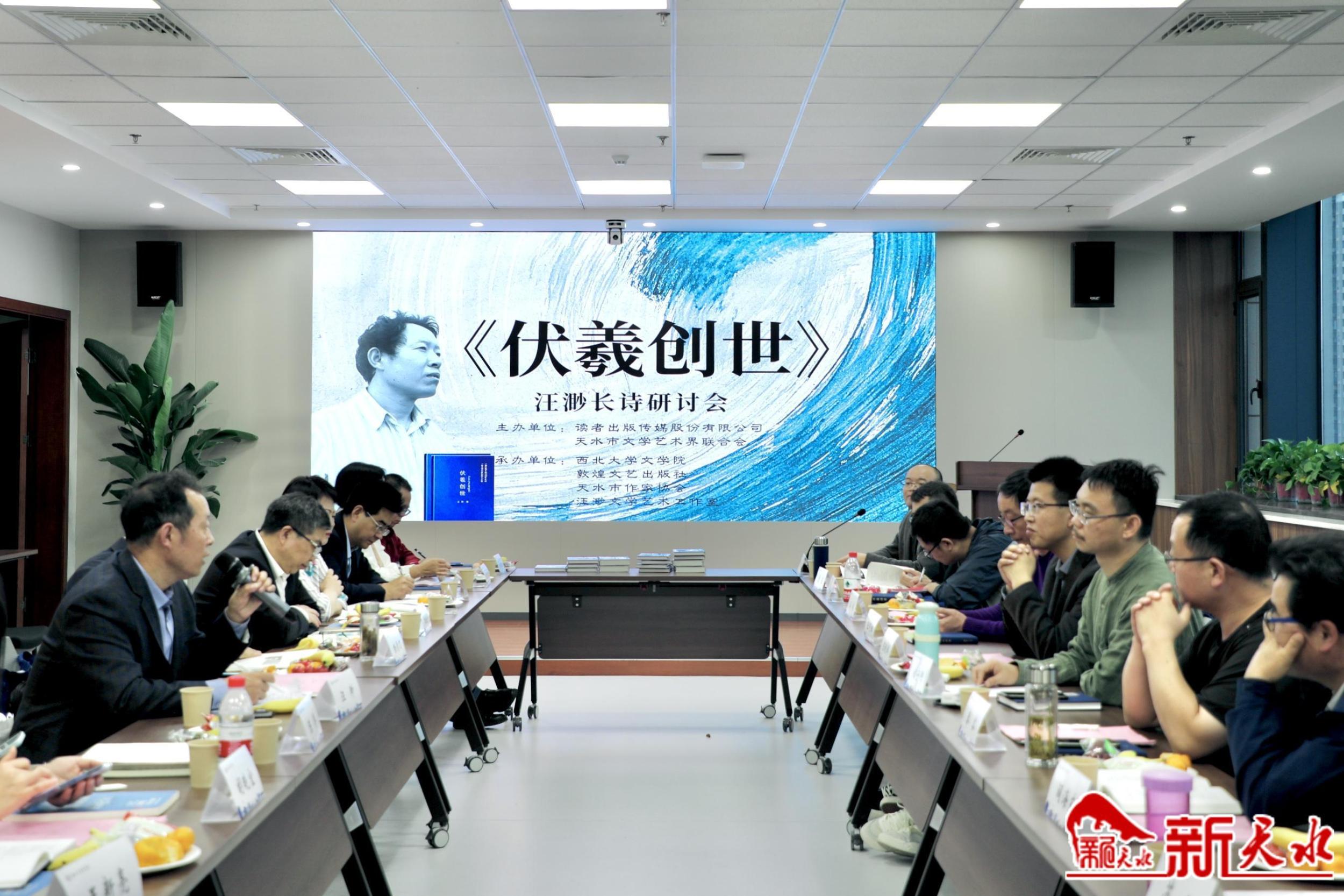 新天水訊【記者楊華 陳光毅】10月14日,天水詩人汪渺長詩《伏羲創(chuàng)世》研討會(huì)在西北大學(xué)文學(xué)院舉辦。本次研討會(huì)由讀者出版?zhèn)髅焦煞萦邢薰?、天水市文?lián)主辦,西北大學(xué)文學(xué)院、敦煌文藝出版社、天水市作協(xié)、汪渺文學(xué)藝術(shù)工作室承辦。