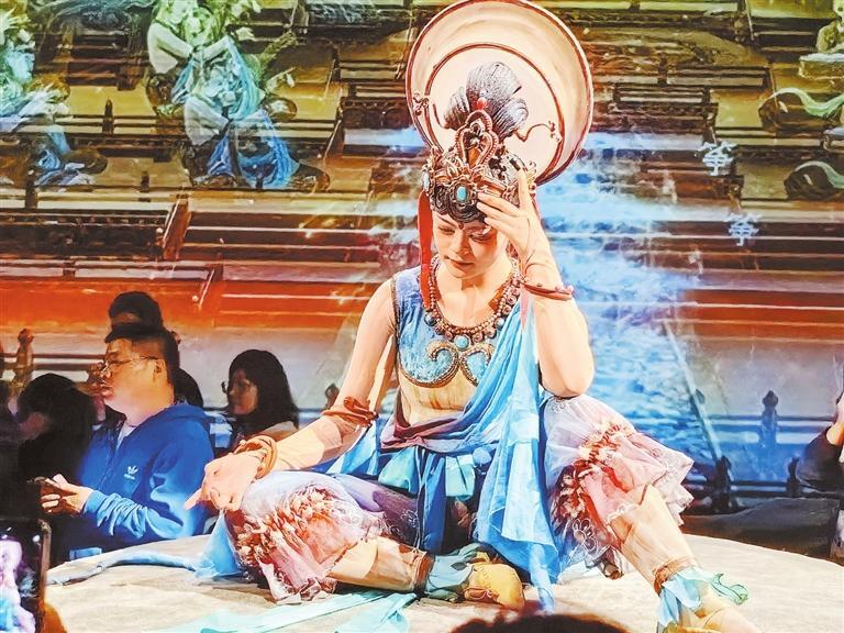 “真是一場酣暢淋漓的敦煌樂舞盛宴。雖然這趟旅程我們還沒有去敦煌莫高窟,但看罷這場演出,已經(jīng)對莫高窟壁畫有了初步的認(rèn)知。莫高窟壁畫的精華部分,借助高科技手段和演員的精彩演繹,在我們眼前立體延展開來,同時(shí)劇場內(nèi)大量復(fù)刻了佛龕、蓮花臺、藻井等特色形制,讓我們‘一眼入境’,帶我們走進(jìn)歷史深處,觸摸文明脈動(dòng)。”浙江游客王松攜家人觀看《樂動(dòng)敦煌》后,發(fā)出贊嘆。