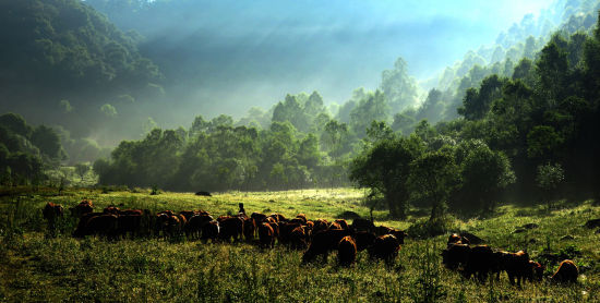 同樣是在天水市的張家川,關(guān)山,那列人文印痕飽滿的山脈像一條綠絲帶在我們面前展現(xiàn)著無盡的美麗,只是在張家川境內(nèi),它的旋律卻像是被擰緊的琴弦發(fā)出的,凝結(jié),突兀,而在相鄰的陜西省隴縣,它才盡情地展示著牧場的魅力,每一處峰巒山頂上還是一片林子,到了山腰卻變成了美麗的草甸,遍布牛馬。