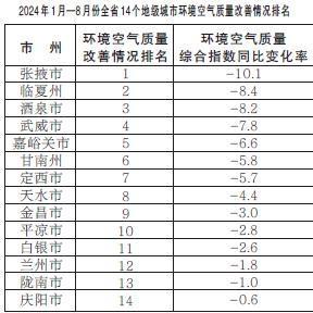 2024年1月—8月份,全省14個(gè)地級(jí)城市環(huán)境空氣質(zhì)量改善情況排名由好到差分別為:張掖市、臨夏州、酒泉市、武威市、嘉峪關(guān)市、甘南州、定西市、天水市、金昌市、平?jīng)鍪小足y市、蘭州市、隴南市、慶陽(yáng)市。