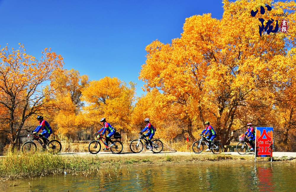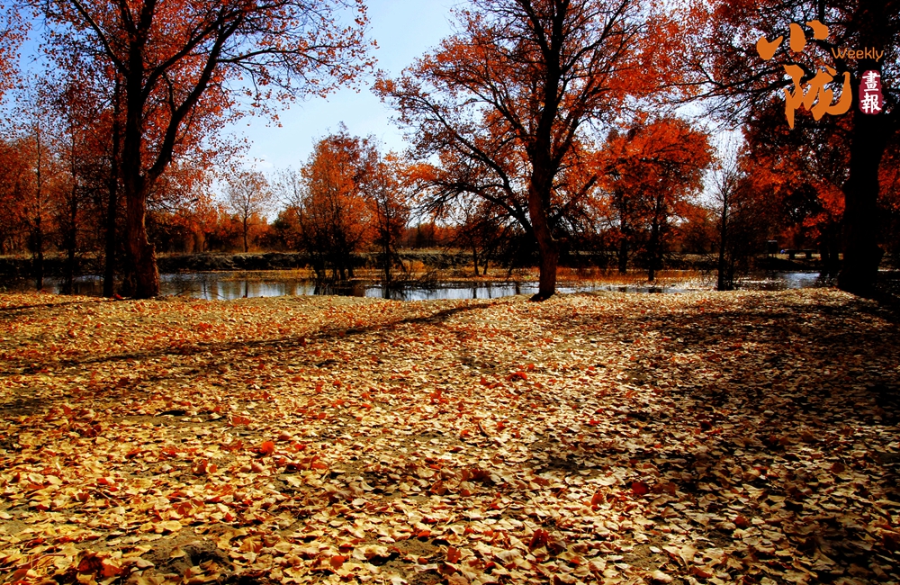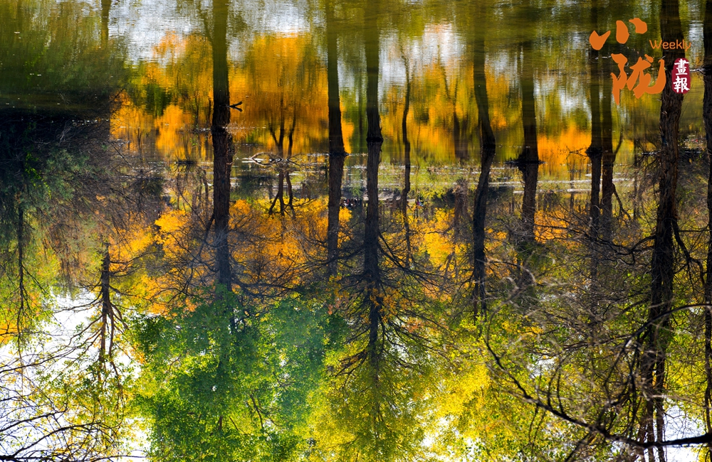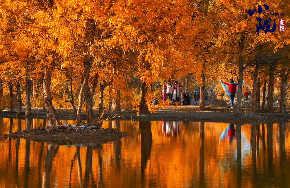 湛藍的天空、清澈的湖水、倒影的胡楊、金色的落葉,斑斕得如同油畫色彩。