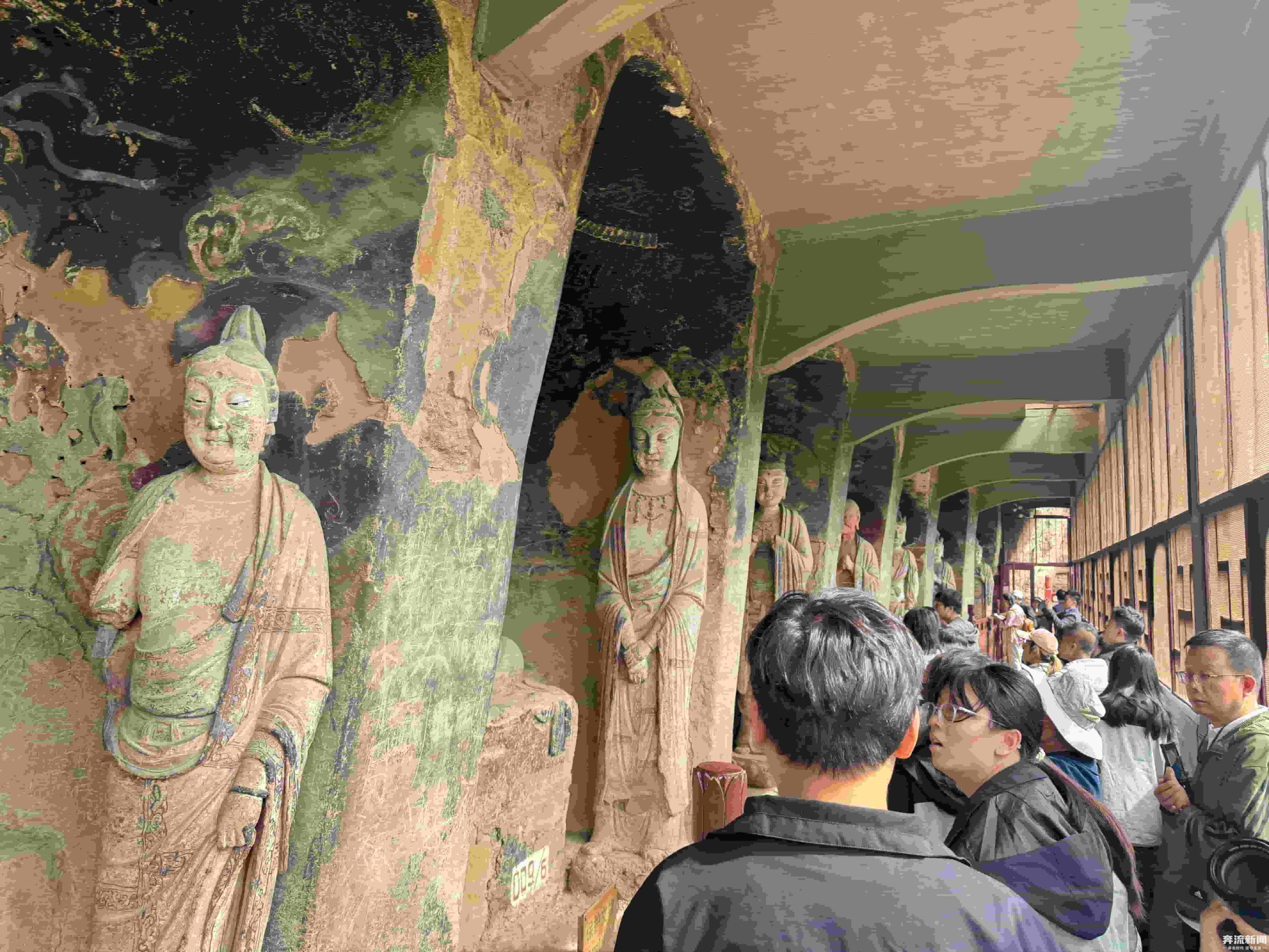沿著凌空架設(shè)的棧道蜿蜒而上,仿若攀緣九霄云端。千姿百態(tài)的造像、總面積約1000平方米的壁畫以及精雕細(xì)琢的仿木崖閣建筑等文物遺跡依次呈現(xiàn)在眼前。