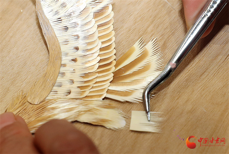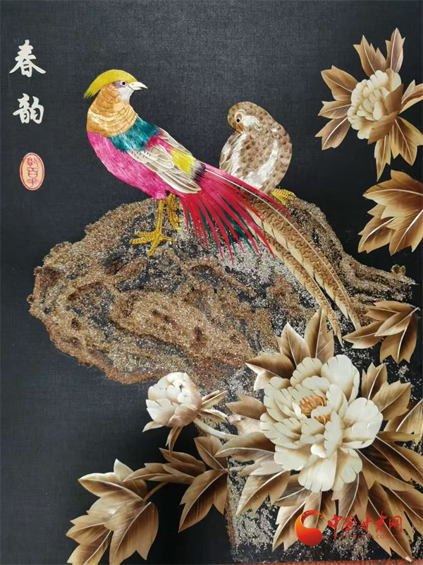 多年打磨后,郭百花走出了獨(dú)特的創(chuàng)作之路——以拼貼手法為主,讓作品更具層次感與立體感。在她十幾平米的“百花麥稈藝術(shù)工作室”里,《春韻》勾勒出江南詩意,《敦煌文旅》再現(xiàn)絲路風(fēng)情,《孔雀戲牡丹》盡顯雍容華貴,而《錦上添花》中,小鳥的羽毛竟由細(xì)如發(fā)絲的麥稈剪貼而成,市場價(jià)達(dá)1500元左右。這些作品里,既有山川花鳥的靈動,更藏著通渭的鄉(xiāng)土記憶,平凡麥稈在她手中徹底“化腐朽為神奇”。