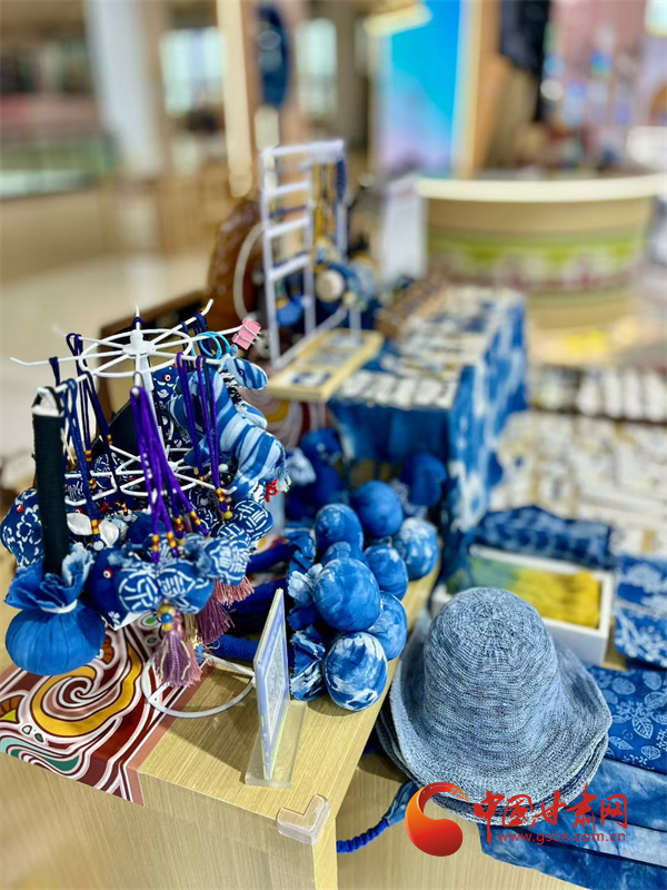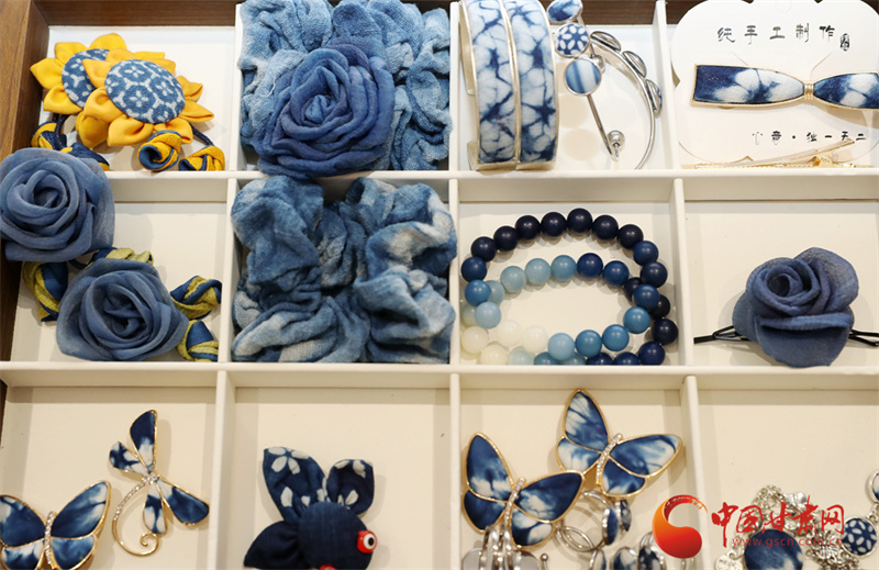 染好的布匹還要經(jīng)過(guò)脫漿、清洗、陰干,最后才是拆線(xiàn)、整理。當(dāng)一塊完整的藍(lán)印花布展現(xiàn)在眼前時(shí),李梅總會(huì)輕輕撫摸布料,仿佛在與草木對(duì)話(huà)。她的工作室里,掛滿(mǎn)了用藍(lán)染制成的物件:桌布上印著成片的板藍(lán)根葉,茶席邊緣綴著小巧的藍(lán)染布扣,就連她日常穿的棉麻衫,也是自己染的淡藍(lán)色。“這些布不是冰冷的商品,是帶著土地溫度的生活。”李梅說(shuō),去年她在平?jīng)龉懦情_(kāi)了一間“藍(lán)染生活館”,游客可以跟著她學(xué)種板藍(lán)根、體驗(yàn)扎染,很多人第一次發(fā)現(xiàn),原來(lái)衣服上的藍(lán)色可以來(lái)自田野,非遺技藝能如此貼近日常。