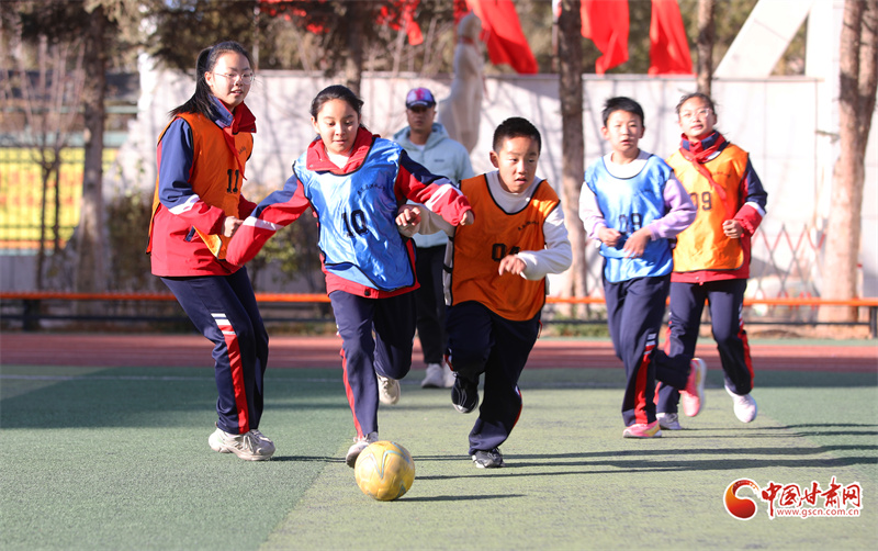11月11日,在張掖市民樂(lè)縣洪水小學(xué)的足球場(chǎng)上,學(xué)生們?cè)谶M(jìn)行足球訓(xùn)練。