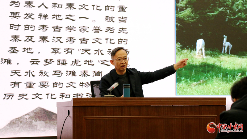 “天水放馬灘秦簡在文物考古、歷史文化、地理交通等研究中具有重要價值,為研究秦的社會性質(zhì)、農(nóng)業(yè)生產(chǎn)、天文歷法、風(fēng)俗習(xí)慣、人民生活等提供了重要資料。放馬灘秦簡還在文字學(xué)和書法發(fā)展史上具有重要價值……”講座上,王振宇著重從天水放馬灘秦簡的主要內(nèi)容及特點、天水放馬灘秦簡的歷史文化及書法價值、對天水放馬灘秦簡研究的幾點思考三個方面,進行了深入淺出的講解,并對今后研究提出了具體建議。