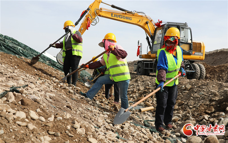 民樂縣大堵麻河防洪治理工程項目施工現(xiàn)場,工人們正在緊張有序地修筑河堤