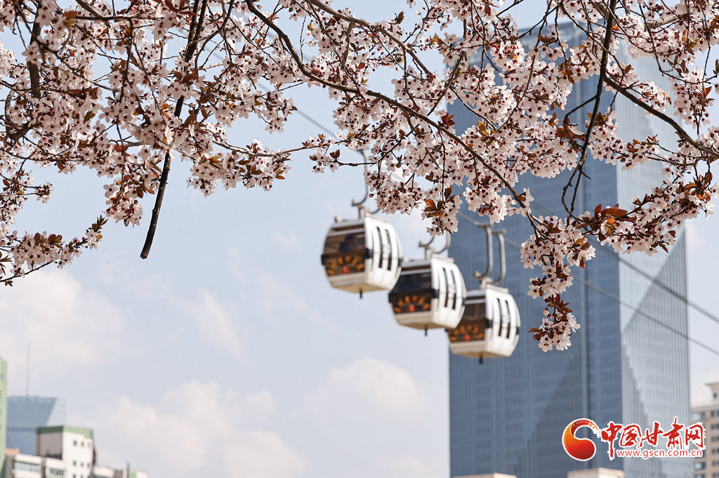 3月31日,在蘭州市城關(guān)區(qū)黃河風(fēng)情線,市民、游客乘坐纜車(chē)賞花游覽。