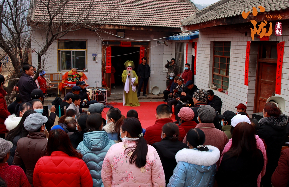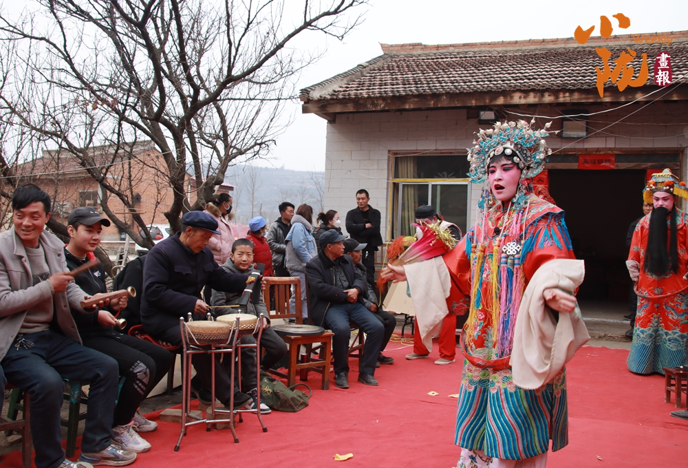 在鄉(xiāng)村院落里,一位身著傳統(tǒng)戲服、頭戴精致頭飾的演員站在鋪著紅地毯的簡(jiǎn)易舞臺(tái)上,手持道具投入表演。臺(tái)下圍滿了村民,大家神情專(zhuān)注,整個(gè)場(chǎng)景充滿濃郁的鄉(xiāng)土氣息與傳統(tǒng)民俗韻味。