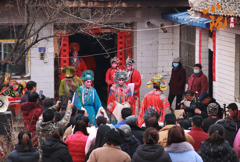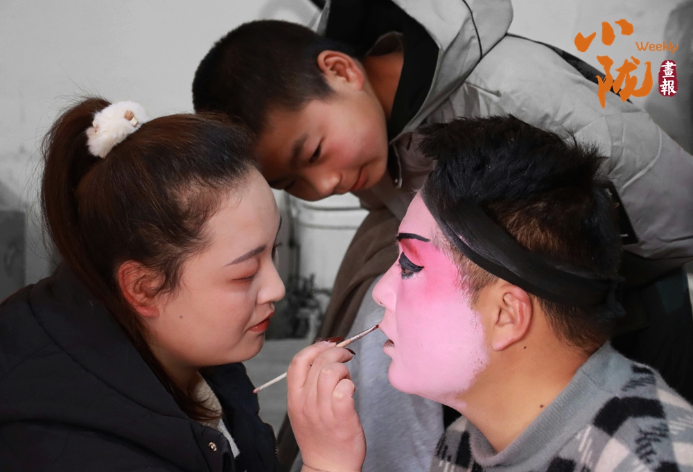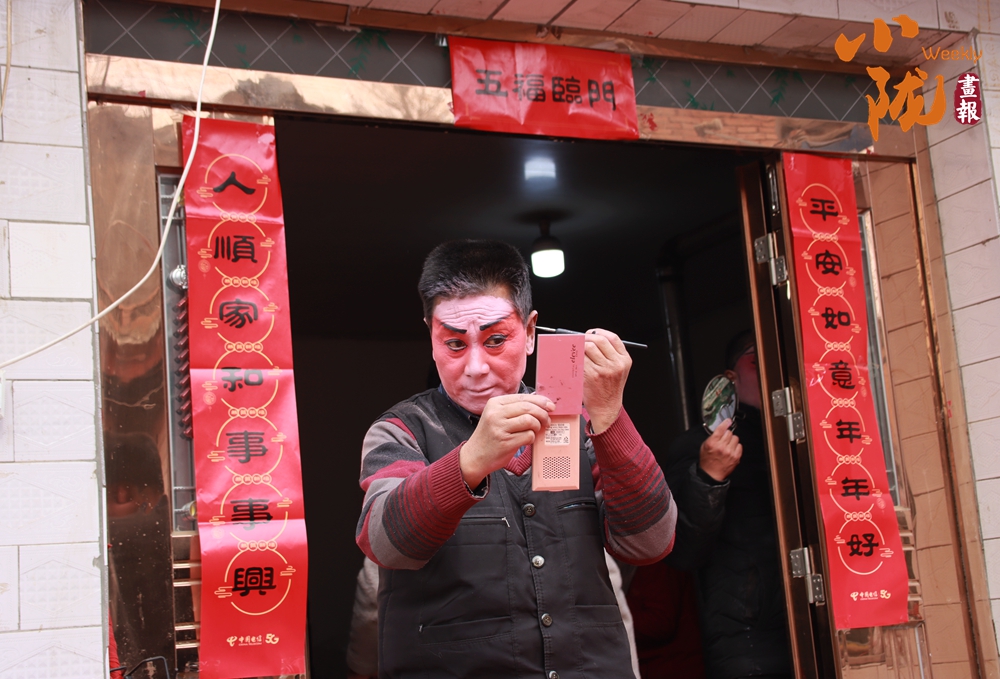 貼著紅春聯(lián)的屋門(mén)口,一位畫(huà)著戲曲臉譜的演員正對(duì)著手機(jī)調(diào)整妝容。這充滿鄉(xiāng)土氣息的戲曲準(zhǔn)備場(chǎng)景,滿是民間年俗里熱鬧又質(zhì)樸的煙火氣,也藏著傳統(tǒng)藝術(shù)在鄉(xiāng)土間的鮮活傳承。