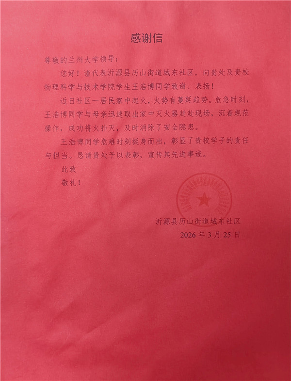 近日,一封社區(qū)致蘭州大學(xué)的感謝信,讓該校物理科學(xué)與技術(shù)學(xué)院學(xué)生王浩博的暖心事跡走進公眾視野。2026年3月3日,元宵夜,放假居家的他偶遇居民樓突發(fā)火情,憑借校園培訓(xùn)習(xí)得的消防技能,沉著處置初起火災(zāi)、轉(zhuǎn)移危險物品,以本能之舉守護鄰里安全,彰顯新時代青年的責(zé)任與擔(dān)當。