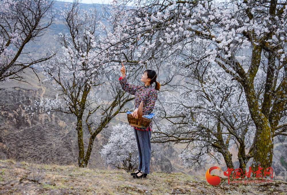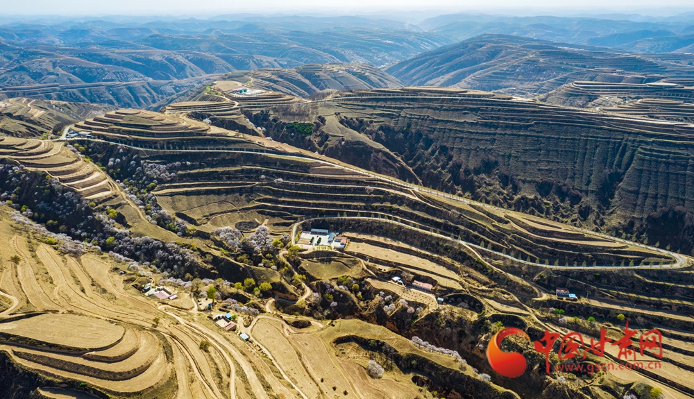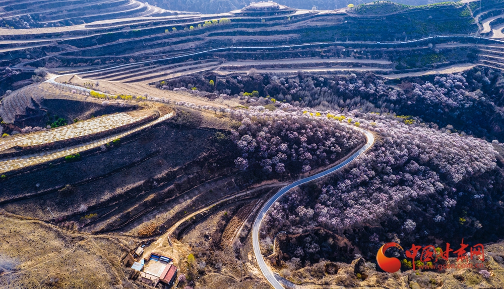 梯田層疊如浪,杏花綴滿山野,黃土坡煥發(fā)生機