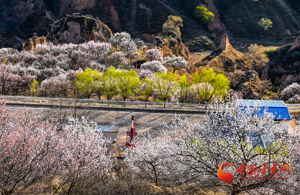 杏花盛放,粉白花海漫過溝壑,新綠枝椏點綴其間,山野間滿是春日的爛漫與生機
