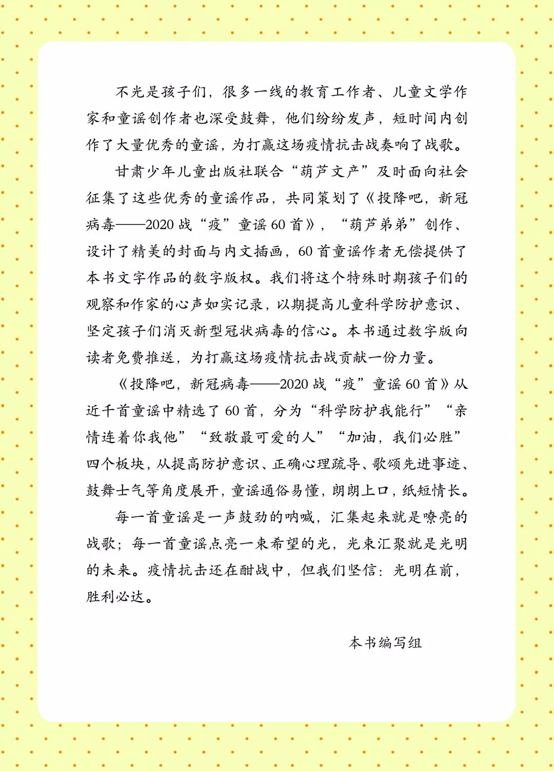 讀者出版?zhèn)髅焦煞萦邢薰舅鶎俑拭C少年兒童出版社積極響應(yīng)、主動作為,聯(lián)合“葫蘆文產(chǎn)”,策劃了《投降吧,新冠病毒——2020戰(zhàn)“疫”童謠60首》一書,將這些優(yōu)秀的童謠作品進行編輯加工,以期提高兒童科學(xué)防護意識,幫助大家堅定抗“疫”勝利的信心。本書通過數(shù)字版向讀者免費推送,為打贏這場疫情防控阻擊戰(zhàn)貢獻一份力量。