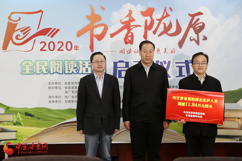 啟動(dòng)儀式上,省委宣傳部副部長(zhǎng)、省新聞出版(版權(quán))局局長(zhǎng)王成勇宣布2020年“書(shū)香隴原”全民閱讀活動(dòng)正式啟動(dòng)。省委宣傳部聯(lián)合讀者集團(tuán)新華書(shū)店飛天傳媒股份有限公司通過(guò)省衛(wèi)生健康委,向全省796名支援湖北醫(yī)護(hù)人員贈(zèng)送了價(jià)值11.94萬(wàn)元的圖書(shū)。省內(nèi)10家出版社的相關(guān)負(fù)責(zé)人通過(guò)中國(guó)甘肅網(wǎng)現(xiàn)場(chǎng)直播為現(xiàn)場(chǎng)嘉賓、廣大網(wǎng)友推介優(yōu)秀甘版圖書(shū)。