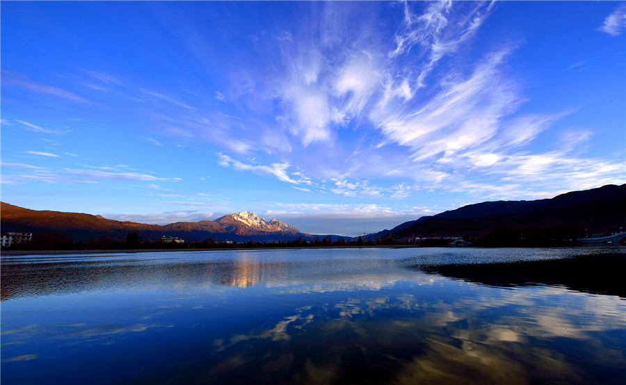 我是被亮光驚醒的。我和很多水從象山腳下的黑龍?zhí)睹俺鰜?。咕咚一聲翻上水面??匆姾芏嗖煌拥娜恕:陬^發(fā)的人,黃頭發(fā)的人。黑眼睛的人,藍眼睛的人。我看見了潭邊的亭臺樓閣??匆娏嘶ㄅc樹。我還順著人們遠眺的目光看見了玉龍雪山,晶瑩奪目矗立在藍天下面。潭水映照雪山,真讓人目眩神迷啊。人們在橋上,在堤上,說著不同的語言。在不同的語言里,都有那個詞頻頻出現(xiàn):麗江,麗江。這時的麗江已經(jīng)是一座很大的城了。城里也不是只有最初筑城的納西人了。如今全中國全世界的人都要來麗江,看納西古城的四方街,看玉龍雪山。