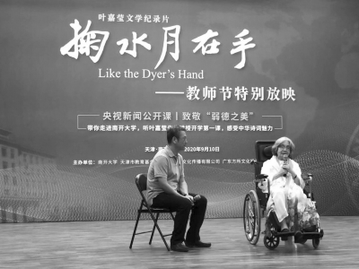 九月十日教師節(jié),南開大學(xué)舉辦《掬水月在手》影片首映式。葉嘉瑩先生是國(guó)際儒聯(lián)榮譽(yù)顧問,我銜命陪同王念寧副會(huì)長(zhǎng)專程赴南開致賀,有幸在南開禮堂聆聽九十六歲高齡的迦陵先生與白巖松共話詩意人生。迦陵先生坐在輪椅上娓娓道來,鬢發(fā)皤然,聲如洪鐘,風(fēng)華絕代。