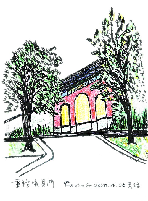 書已寫罷,小寒節(jié)氣過后,我又多次去天壇,不為寫作,只是習(xí)慣,仿佛腳步慣性,去天壇轉(zhuǎn)轉(zhuǎn),就會(huì)感覺充實(shí)一些。2020年1月20日正值大寒節(jié)氣,那天下午,我從圜丘到成貞門西北側(cè),那里并排有兩把座椅,我坐在座椅上畫成貞門。春節(jié)將近,除了工人在懸掛紅燈籠、安裝慶祝春節(jié)的展牌,天壇里的游人并不多。我和很多游人一樣,不知道,或者說不敏感,一場疫情正如餓虎撲食那樣向我們迫近。