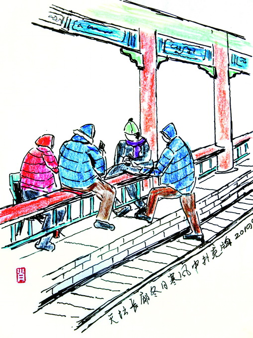 童年時(shí),我家離天壇很近,即便是現(xiàn)在的住所,離天壇也不算遠(yuǎn),地利之便,使我和天壇有種天生的緣分。這種緣分不是一見鐘情,而像長時(shí)間接觸磨出來的老繭,結(jié)實(shí)且持久。幾十年來,天壇是我最常去的公園,最近幾年迷上畫畫,更要去那里畫速寫。由于畫畫,身邊總會(huì)站著幾個(gè)看畫的人,無論褒貶,一定得聊上幾句。以前有人看我畫畫,我老覺得不自在,后來臉皮不僅變厚了,心里還冒出個(gè)念頭:如果天天到這里畫畫,可以接觸到好多人,隨手記下各色人等的人生百態(tài),這不是挺有意思的嗎?