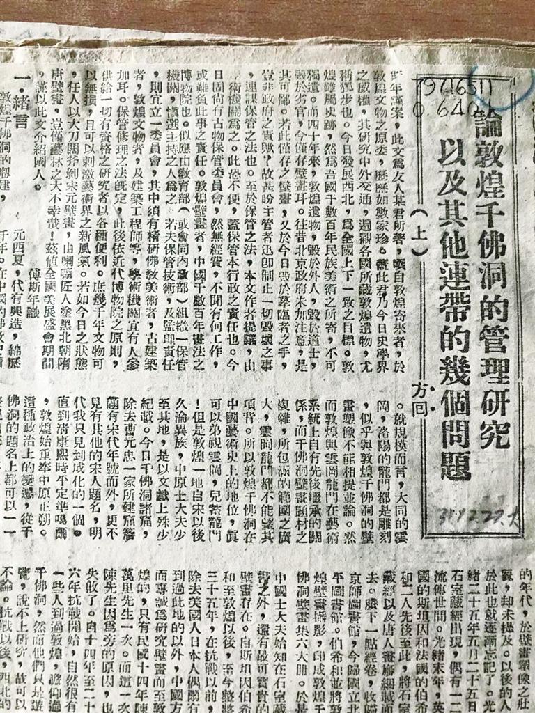 向達先生曾先后兩次考察敦煌,第一次是在1942年4月,中央研究院組織西北史地考察團,其中的歷史考古組由中央研究院歷史語言研究所、中央博物院與北京大學聯(lián)合組成,向達代表北大并擔任歷史考古組主任。在這次考察中,他在給友人、南京博物院院長曾昭燏的信件中講述了他第一次看到敦煌莫高窟時的激動心情,同時對于莫高窟受到自然和人為的毀壞而感到痛心。他用三天的時間寫成了一萬多字、此后對敦煌學有重大影響的《論敦煌千佛洞的管理研究以及其他連帶的幾個問題》,署名“方回”寄給了傅斯年,后經傅斯年推薦,在重慶的《大公報》連載發(fā)表,文中提出將千佛洞收歸國有,由學術機構進行管理,開展研究工作等建議。此文發(fā)表,一石激起千層浪,直接推動國立敦煌藝術研究所于1944年成立。研究所成立后,常書鴻任所長。這也開啟了“敦煌學”長流不息的淵源。樊錦詩后來也撰文稱:“他(向達)文章中提出的關于保護和管理的具體建議,被后來成立的敦煌藝術研究所采納,成為敦煌石窟保護和管理的參照。向達提出的‘不可輕易剝離壁畫’的主張,也是敦煌研究院幾十年來在壁畫保護和管理中一直恪守的紀律和原則。”