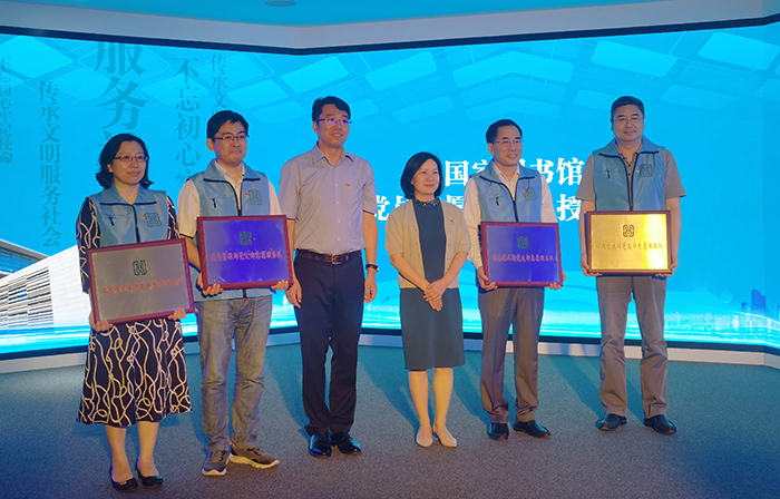 6月8日上午,國家圖書館新閱讀空間開放暨黨員志愿服務(wù)總隊成立活動在國家圖書館總館北區(qū)舉行。活動現(xiàn)場,國家圖書館黨委書記、副館長魏大威,國家圖書館副館長、黨委副書記陳櫻為4支黨員志愿服務(wù)分隊代表授牌。
