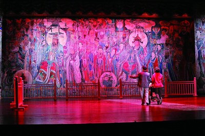 《永樂宮紀(jì)事》創(chuàng)造性地將蒲劇、歌劇、舞劇、話劇、音樂劇等多種藝術(shù)形式有機結(jié)合、融為一體,在充分利用地域文化元素的同時,還將珍貴的永樂宮壁畫與現(xiàn)代聲光電等舞臺技術(shù)有機結(jié)合,營造出絢麗多彩的舞臺效果。