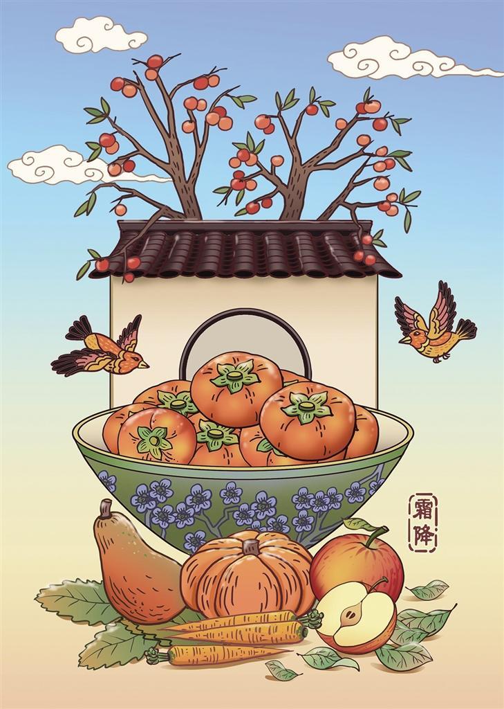“每年10月23日前后為霜降,這是隸屬秋季的最后一個(gè)節(jié)氣。”據(jù)中國(guó)氣象局氣象服務(wù)首席專家、中央電視臺(tái)《天氣預(yù)報(bào)》節(jié)目主持人宋英杰介紹:“秋時(shí)已,亦稱秋(miao,樹(shù)梢)秋,即將畫上句號(hào)。秋日素秋,風(fēng)日謝風(fēng),辰日霜辰,草日衰草,木日疏木。‘氣肅而霜降,陰始凝也’,水汽凝華為白色冰晶。”