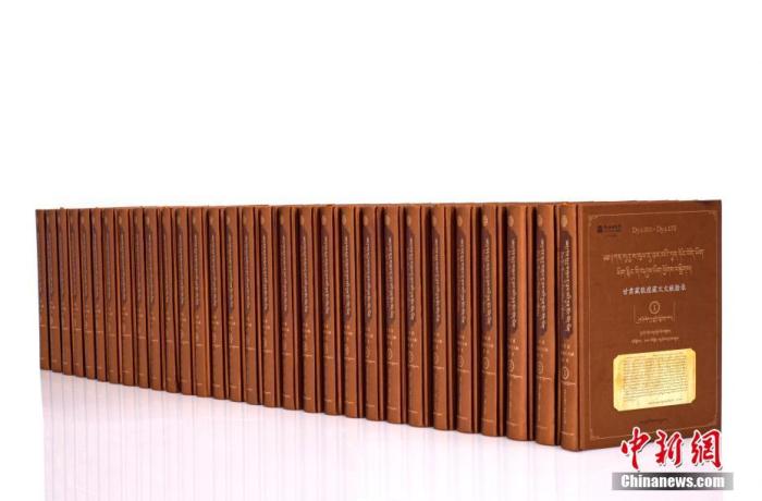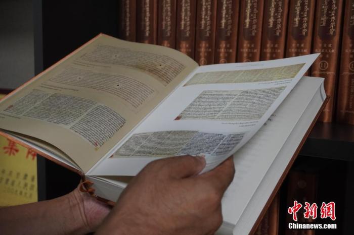 8月26日,甘肅蘭州,甘肅民族出版社資料室內(nèi)收藏的《甘肅藏敦煌藏文文獻(xiàn)勘錄》。該叢書共30卷,約2205余萬字,收錄了6700余件甘肅藏敦煌藏文文獻(xiàn),系國內(nèi)外首次以全文錄入的方式出版。 中新社記者 九美旦增 攝