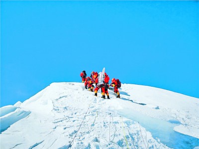 珠峰是地球的驕傲,人類探險精神和探索精神的制高點與交匯處。登頂珠峰,是人體內(nèi)冒險因子的永恒主題,是人類挑戰(zhàn)自身、挑戰(zhàn)極限、創(chuàng)新紀(jì)錄的不朽篇章。一次又一次登頂珠峰的背后,顯示人性中更多的征服欲和榮譽(yù)感,凸現(xiàn)難以用言語表達(dá)的從肉體到思想,甚至到生命的付出。