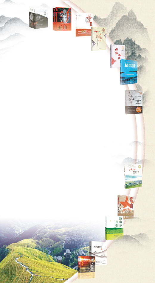 書影圖片從上至下依次為《人世間》《主角》《海邊春秋》《十八洞村的十八個故事》《國家溫度》《琵琶圍》《遠(yuǎn)去的白馬》《江山如此多嬌》《靠山》《新山鄉(xiāng)巨變》《西海固筆記》《重卡雄風(fēng)》(按出版時間排序)。何向陽 供圖;底圖為廣西龍勝各族自治縣龍脊梯田景色。韋吉陽 攝(人民視覺)