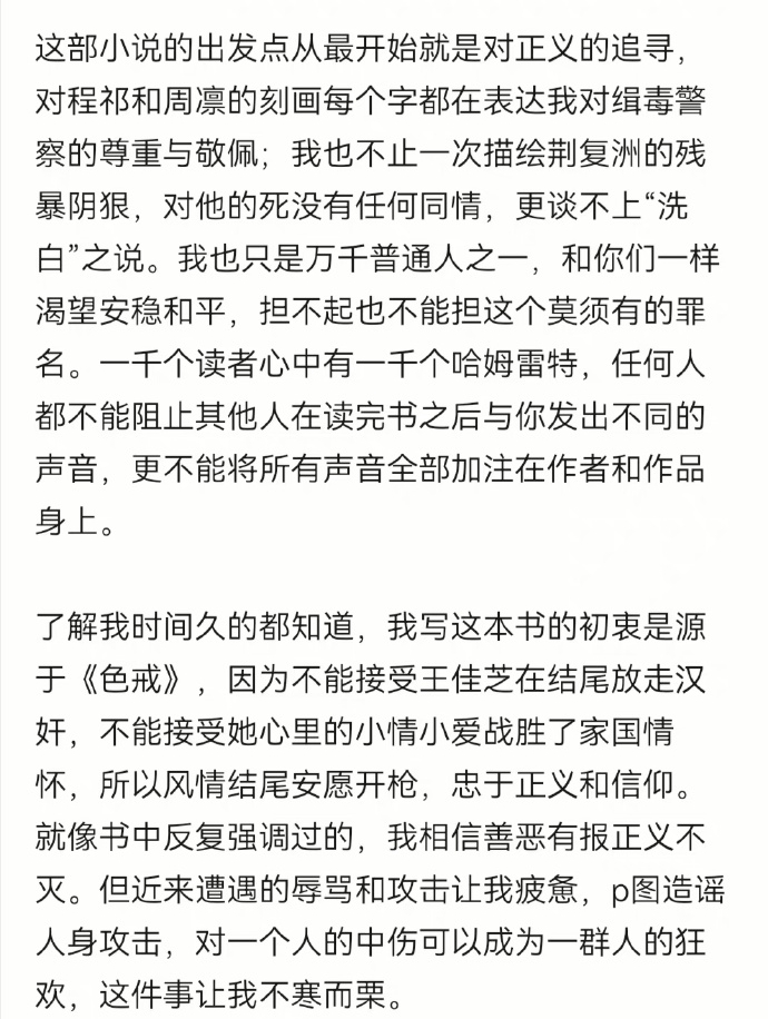 在去年10月14日,疑似《風(fēng)情不搖晃》的作者在其未經(jīng)認證的社交媒體賬號上表示,“小說的出發(fā)點是對正義的追尋”。在發(fā)布這條內(nèi)容后,其賬號再未更新,該條微博也關(guān)閉了評論。