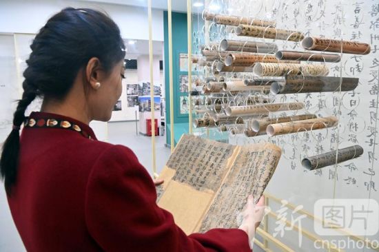 3月14日,敦煌研究院敦煌文獻研究所所長趙曉星接受中新社記者專訪介紹稱,全彩印《敦煌文獻全集》出版工作已正式啟動,該叢書采用全彩印的方式刊布敦煌文獻,實現(xiàn)敦煌文獻在線下圖錄中的高清還原。敦煌文獻,又稱敦煌遺書,是指1900年在甘肅敦煌莫高窟藏經(jīng)洞發(fā)現(xiàn)的公元4世紀至11世紀的寫本、印本和拓片等文獻。據(jù)最新統(tǒng)計顯示,其總數(shù)近7萬件。目前這些文獻分藏于中、英、法、俄、日等國的數(shù)十家收藏機構(gòu),一直缺乏完整的聯(lián)合目錄。圖為3月3日,工作人員在敦煌藝術(shù)館卷軸墻前閱覽敦煌遺書影印品。 中新社記者 九美旦增 攝