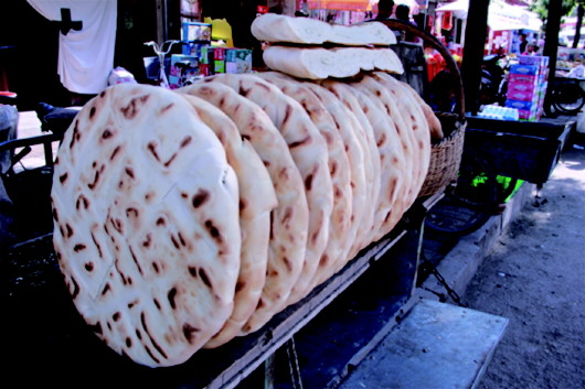 將面粉中加入一定比例的堿水,調(diào)和成面團(tuán)揉入早發(fā)酵好的面團(tuán),然后再添入大量干面,接下來才是關(guān)鍵所在:用堅硬、光滑、沉重的木頭杠子一頭固定(形如杠桿),一頭人工操作,反復(fù)揉壓面團(tuán),直到將干面團(tuán)壓成綢子一樣綿軟,再切成1斤、2斤或3斤的面劑子,搟成圓餅狀,抹上清油,撒上少許鹽和胡椒、苦豆、姜黃等佐料,最后將面餅卷起來,豎立壓制成團(tuán),再用木杠搟壓成厚而大的圓餅,并在上面用干凈的梳齒等工具精心旋出花紋圖案,抹少許清油,便可上鏊烘烤。