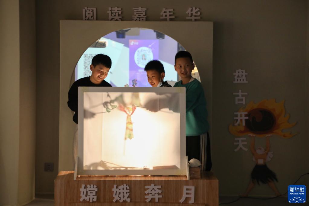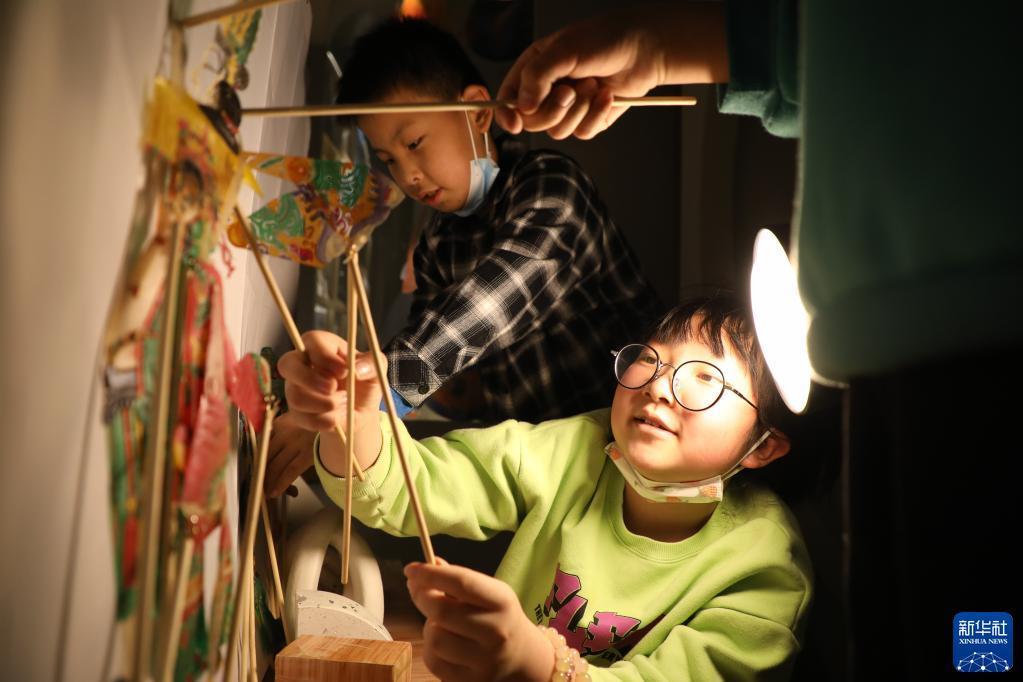 4月1日,在甘肅省蘭州市的讀者出版集團(tuán)數(shù)字閱讀中心讀者小站,小朋友體驗(yàn)中國(guó)神話故事主題皮影戲。新華社記者 馬希平 攝