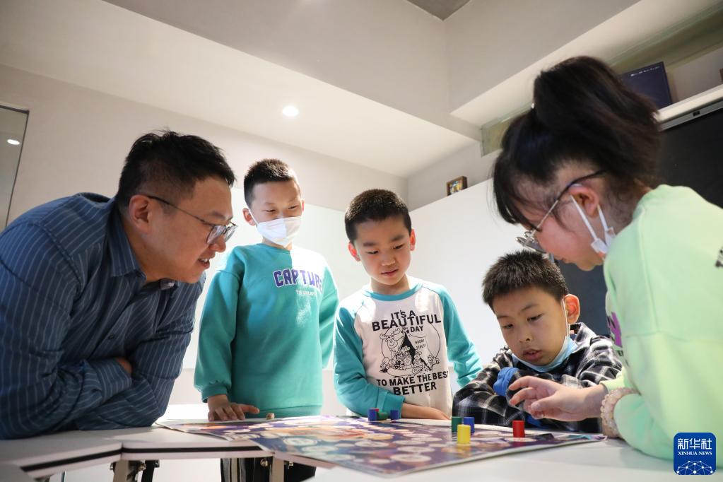 4月1日,在甘肅省蘭州市的讀者出版集團(tuán)數(shù)字閱讀中心讀者小站,工作人員與小朋友一起玩“講述中國(guó)神話故事”的飛行棋游戲。新華社記者 馬希平 攝