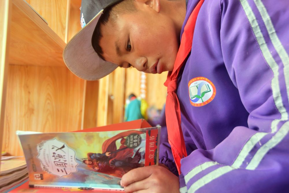 格桑加措的英語老師潘紅培將圖書整理分類,她來自河南,已在申亞鄉(xiāng)小學(xué)支教兩年多。她說:“書籍是給孩子們最好的禮物,使孩子們的心靈受到滋潤、生活更加美好。有時候,他們吃飯時也要帶上書。”