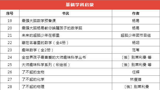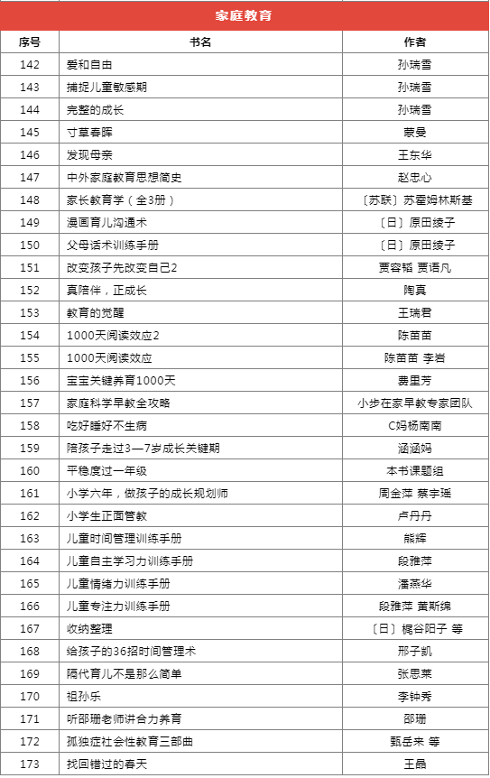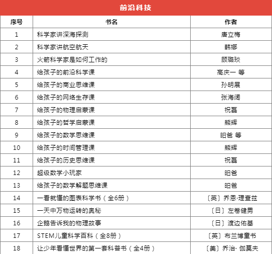 推薦書目種類繁多,分為前沿科技、基礎(chǔ)學(xué)科啟蒙、自然科學(xué)、家庭教育等十個類別,共計173本(套)。
