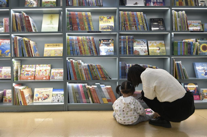 10月18日,家長(zhǎng)帶著小朋友在鄭州市緯五路第一小學(xué)校園閱讀中心內(nèi)閱讀。