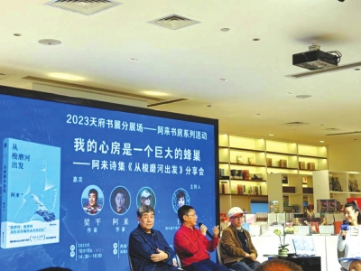 2023天府書展,各種名家分享會讓讀者應接不暇。除了成都世紀城新會展中心主會場,分會場的活動也精彩紛呈。10月15日下午,在西部文化產(chǎn)業(yè)中心阿來書房,阿來、葉舟、梁平三位名家開啟“我的心房是一個巨大的蜂巢——阿來詩集《從梭磨河出發(fā)》分享會”。三人上演老友記,分享會由阿來的青春期談起,氛圍詼諧幽默、愜意深情。