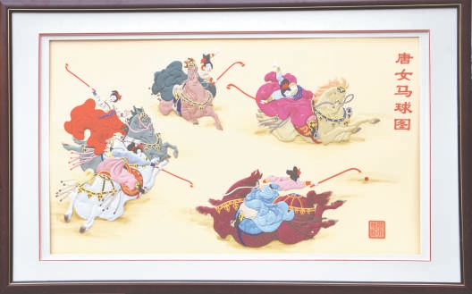 北京補(bǔ)繡代表作《唐女馬球圖》,色彩明艷,動(dòng)感十足。